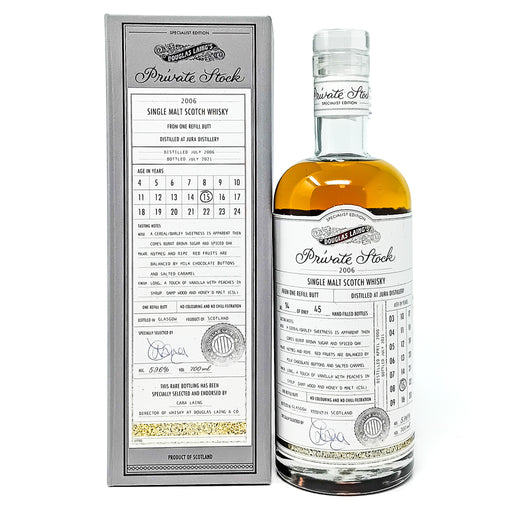 View full detailsCharged from one Refill Hogshead, personally selected by Fred Laing, this Private Stock Jura 2006 15 Year Old was bottled directly from the Douglas...