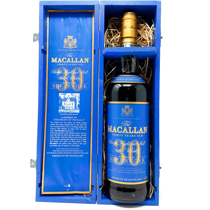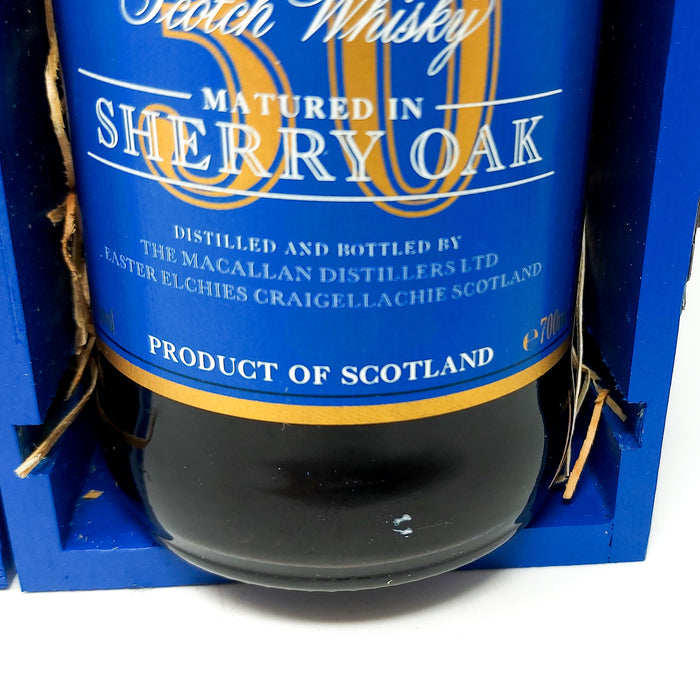 This vintage Macallan 30 Year Old Sherry Oak Single Malt Scotch Whisky was bottled between the late 1990s and early 2000s, displaying the classic blue label that is very highly sought after by connoisseurs and collectors.