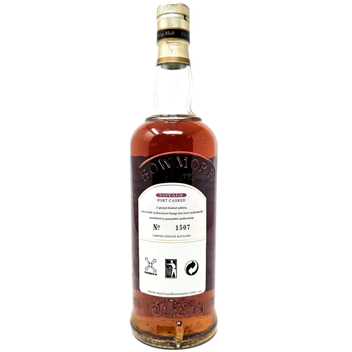 The Bowmore Voyage Port Casked Single Malt Scotch Whisky is a limited edition release produced in 2000. This selection from the Bowmore distillery on Islay is finished in port casks and bottled at a cask strength of 56% ABV in a 70cl bottle. It is presented in a factual manner for collectors and connoisseurs seeking investment-grade whisky.
