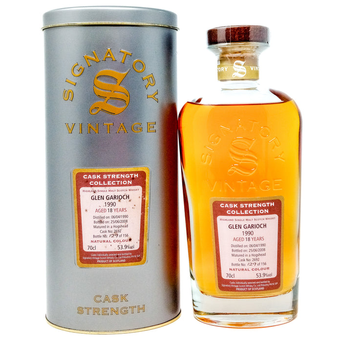 This exceptional Single Malt Scotch Whisky from the Glen Garioch Distillery, independently bottled by Signatory Vintage, offers a rare and collectible experience. Distilled on 6th April 1990 and aged 18 years in a hogshead cask before being bottled on 25th June 2008 from cask #2692. One of only 156 bottles produced.