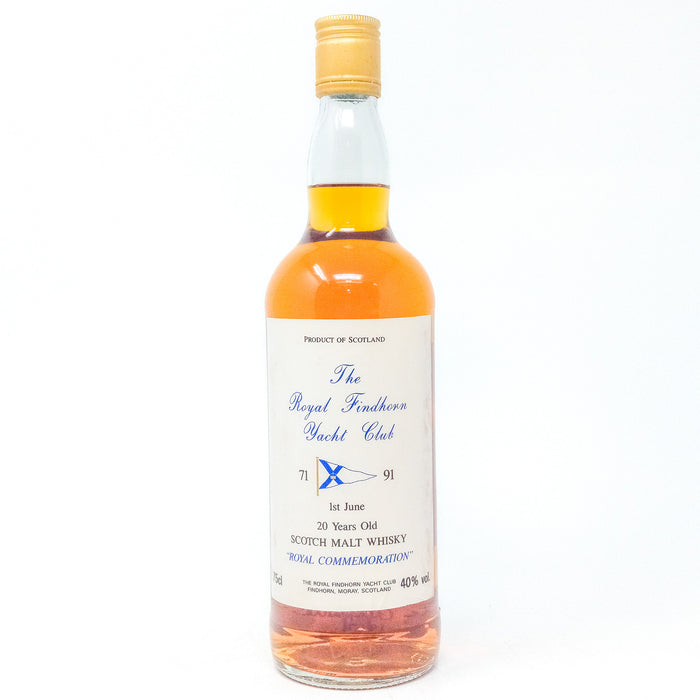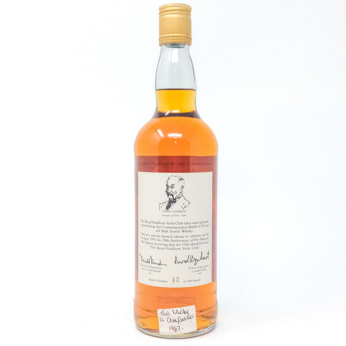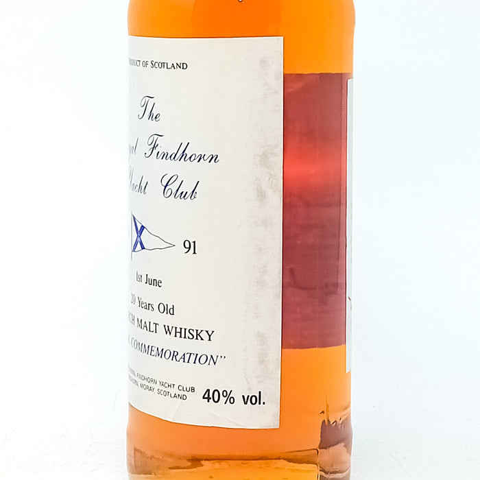 A commemorative bottling of Glenfarclas 20 Year old whisky bottled for The Royal Findhorn Yacht Club. This bottling marks the 20th Anniversary of Queen Elizabeth II decreeing that the club should be come "Royal Findhorn Yacht Club" on the 1st June 1991. David Urqhart, who was Commodore of the club when this was bottled, was a member of the Urquart family of Gordon & MacPhail independent bottlers.