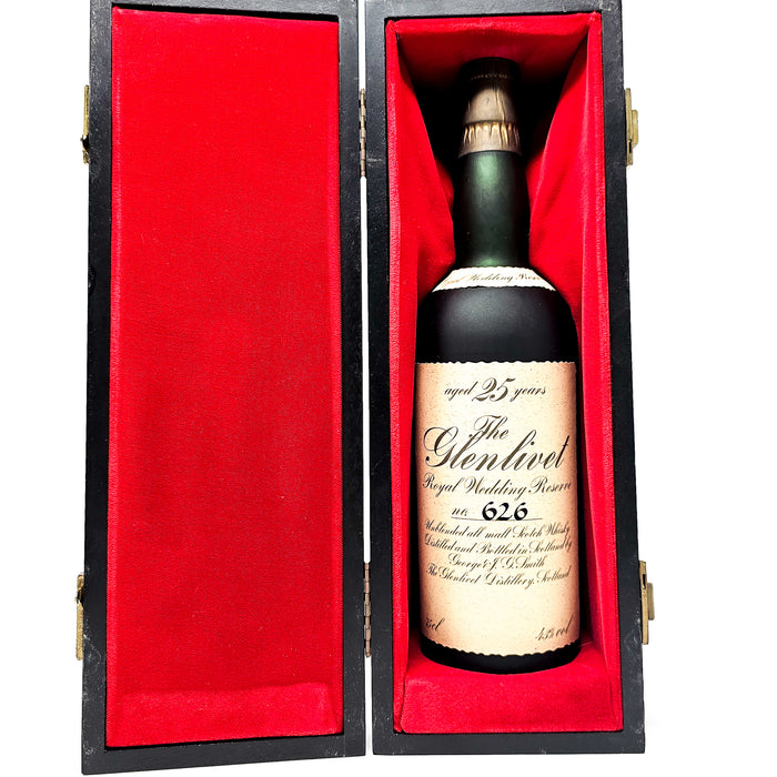 The Glenlivet 25 Year Old Royal Wedding Reserve Single Malt Scotch Whisky commemorates a historic occasion. Released in 1981, this limited-edition bottle is a collector's piece from the renowned Speyside region, known for its exquisite single malt production.