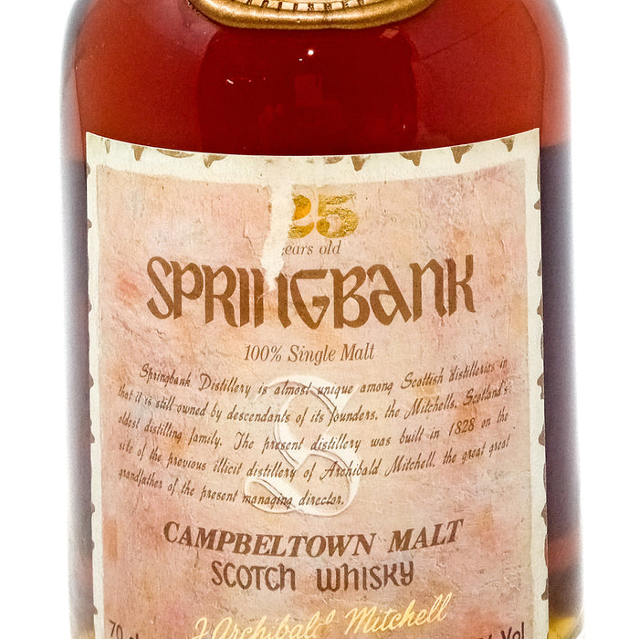 The Springbank 25 Year Old is a 25-year-old single malt Scotch whisky from Campbeltown, bottled by J. Archibald Mitchell in the early 1990s. With an ABV of 46% in a 70cl bottle and aged predominantly in sherry casks, this release offers a clear representation of its production details.